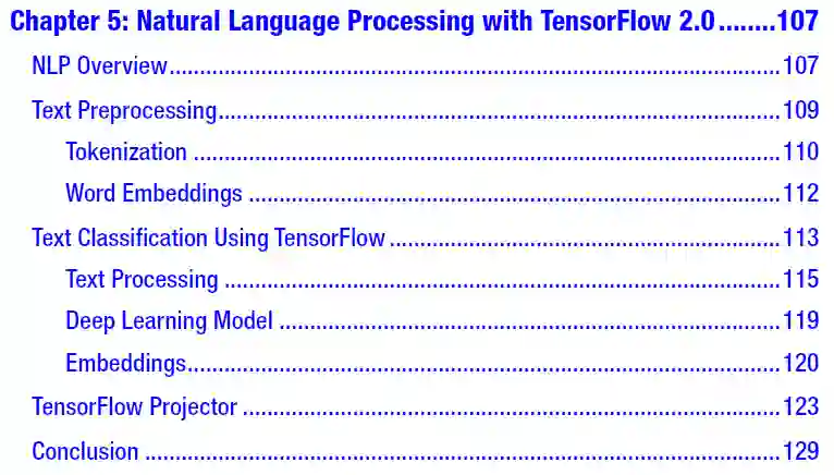 本书的第五章介绍了如何使用TensorFlow2.0 构建自然语言处理模型,包括虚线嵌入、文本分类等。