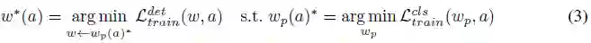 上述公式可以表示在没有预先训练(例如图像分类)的情况下的NAS。但对于目标检测,需要预训练和微调,等式(2)需要变为: