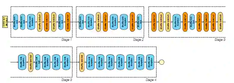 目的是将主要结果与hand-crafted的backbone比较。每个阶段中的通道和块由c_1和n_1指定。在每个阶段中,第一个块的stride为2进行采样。除第一阶段外,还有4个阶段,共有40个要搜索的块。对于每个要搜索的块,从原始ShuffleNetv2块开始有4个选择:用{3×3 ,5×5 ,7×7}更改kernel大小,或用Xception块替换右分支(三个重复的可分离深度3×3卷积)。该搜索空间包括4^40≈1.2×10^24个候选架构。大部分网络计算量超过1G FLOPs。