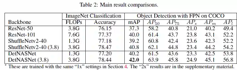 DetNASNet在Large空间中的FPN上进行搜索。如下表所示主要结果。作者列出了三个hand-crafted网络进行比较,包括ResNet-50,ResNet-101和ShuffleNetv2-40。DetNASNet仅1.3G FLOPs即可实现40.2%的mAP,优于ResNet-50和 ResNet-101。