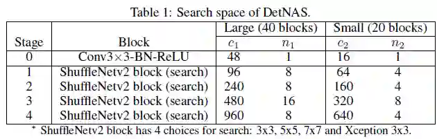 如下图所示为DetNASNet的架构。表1中描述了有关搜索空间的详细信息。搜索空间基于ShuffleNetv2,作者设计了两个不同大小的搜索空间,其中大搜索空间用于主要结果,小搜索空间用于消融研究。