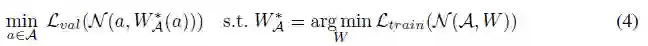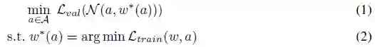 一般情况下,架构搜索空间A可以由有向无环图(DAG)表示。图中的任何路径都对应一个特定的体系架构a∈A。对于特定的体系架构,其对应的网络可以表示为N(α,ω),网络权重为ω。NAS旨在找到使验证损失L_val (N(α*,ω* )) 最小的最佳架构。ω*表示架构α*的最佳网络权重。它是通过最小化训练损失而获得的。可将NAS流程表述为嵌套优化问题: