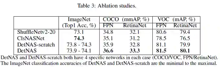 为了消除搜索空间的影响,与 ShuffleNetv2-40(搜索空间的baseline)对比。结果显示,ShuffleNetv2-40在COCO上比DetNAS的mmAP分数低了0.8%。说明DetNAS的效果并未受到搜索空间的影响。