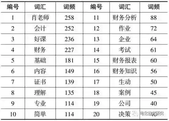 从表2左侧可发现,频次最高的关键词汇是“肖老师”,肖老师是该门在线课程的讲师,其次是“会计”“好课”“财务”“内容”等。这些词汇一定程度上能够表明,学习者不仅表现出对教师本人的认可,而且对课程的内容和教师讲解方式给予了肯定和支持。值得一提的是,“证书”成为排名第七的高频词汇,较强地反应出学习者对在线课程认证的讨论热度和追求。此外,从表2右侧可知,大部分词汇都是与本课程紧密相关的基础知识和专业术语。