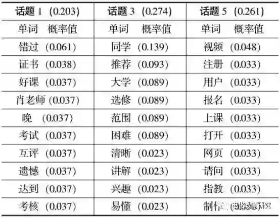 话题数K等于5时,表3b实验效果达到最佳。表3a为课程已完成者的话题—单词矩阵,首先根据学习者关注话题的概率分布,选取出5个概率值显著的话题,然后按照概率值大小列举出每个话题下的10个单词,即某个评论话题下具体的细粒度语义内容。表3b为课程未完成者的话题—单词矩阵。