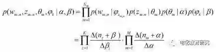 图1表示第m篇文档中的第n个单词所对应的话题,α 和 β是模型的两个先验参数,K表示文档中所有的主题数。根据LDA概率图中变量的依赖关系,构建联合概率分布,其形式化描述如下所示: