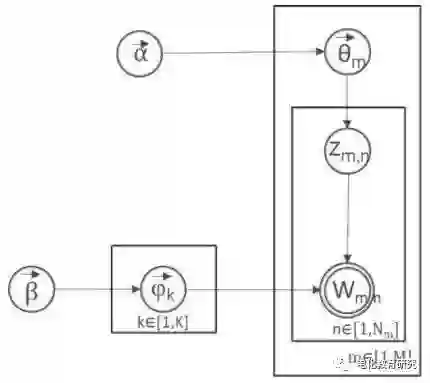 LDA作为机器学习领域的一种非监督话题建模方法[18],是基于PLSI(Probabilistic Latent Semantic Indexing)模型的延伸,最早由Blei在2003年提出,旨在发现大规模文档集中隐藏的话题结构和内容的算法,如今已被广泛应用到多个领域,尤其在商务智能方面,如新闻智能定制服务[19]、电影个性化推荐[20]、社交网络互动[21]等。LDA是一个由文档、话题、单词构成的三层贝叶斯概率图模型,如图1所示。