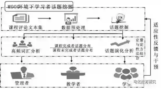 本模块旨在系统地描述MOOC环境下学习者隐含评论话题的挖掘过程,构建一幅服务于管理者、教学者、学习者对象的设计框架图,形成自适应性的闭环,从而支持管理者决策的制定,指导教学者实践教学的开展,提升学习者的学习体验。如图3所示,首先,通过收集MOOC平台中的课程评论文本集,对其进行数据清洗和筛选;然后,结合定量与定性的学习分析方法,实现学习者评论文本的话题挖掘;最后,为管理者、教学者、学习者直观呈现分析的结果,并完成适应性反馈与干预。