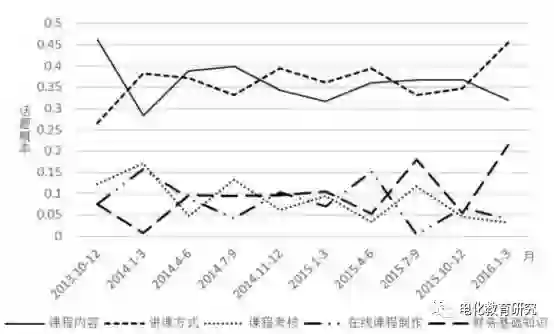 话题演化分析可以快速追踪不同话题的变化态势,直观认识和定位当前的热点话题及概率大小。首先将时间离散化,划分文本集合到不同的时间窗口,然后运用LDA模型计算相应的话题分布,最后描绘出学习者关注话题的演化趋势图。本文基于以上学习者话题挖掘的结果,选取了“课程内容”“讲课方式”“课程考核”“在线课程制作”“财务基础知识”5个热点话题,从2013年10月起到2016年3月止,时间粒度以3个月为单元,进而展开学习者话题演化分析,如图4所示。