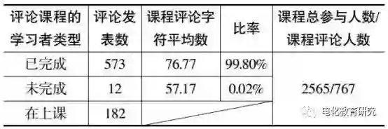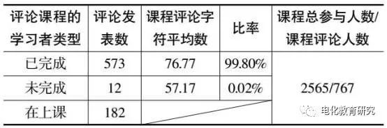 本研究的数据来源于果壳网MOOC学院“财务分析与决策”课程的评论区(mooc.guokr.com)。果壳网MOOC学院是当前融合我国教学特色的在线开放课程平台的应用示范之一,“财务分析与决策”无疑是MOOC学院的在线课程代表,在线课程学习人数已达到2565人,有着丰富的交互数据,从2013年10月到2016年3月之间,767名在线学习者发表了评论文本,通过网络爬虫方法一共获取到767条文本点评数据,每个参与者平均发表1条评论。所有参与发表课程评论的学习者中,课程完成者共计573人,课程未完成者共计12人(由于课程未完成者的评论数较少,对实验的效果可能造成一定的影响),正在上课者共计182人(处于上课状态的学习者,无法判断课程完成情况)。如表1所示,已完成课程者的评论字符平均数明显高于未完成课程者,表明两者在课程评论参与方面存在一定的差异性。