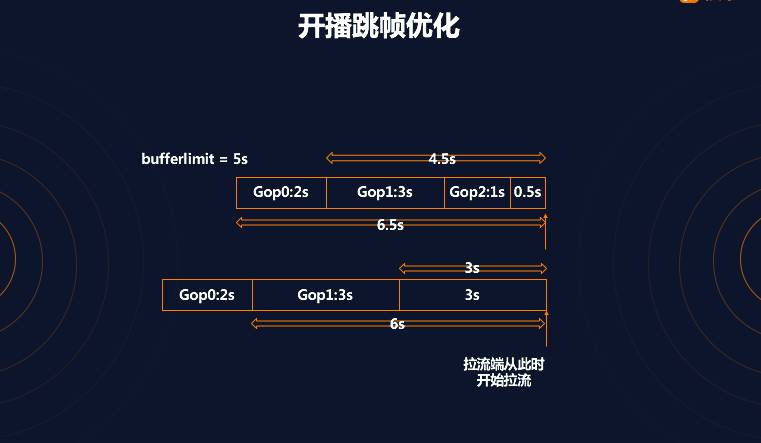 拉流端开播的过程,如前面所述,主要是连接 CDN 节点拉取数据,数据的解码、渲染这几个步骤。CDN 的边缘节点一般都会缓存一部分数据,便于拉流端在任何时刻开始拉流都能拉到数据。为了让用户尽可能的播放流畅,CDN 会尽量的向用户多发一些数据,有时候甚至超过播放端拉流的缓冲区,超过的这部分数据会造成的显著问题是,如果照单全收并且按照正常的速度播,会导致直播延时增大,互动效果变差。业界公认的互动直播延时标准是小于 5 秒钟,超过 5 秒评论礼物互动效果就会变差。因此我们需要在保证延迟的前提下,尽量缩短首屏,提高流畅度。