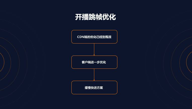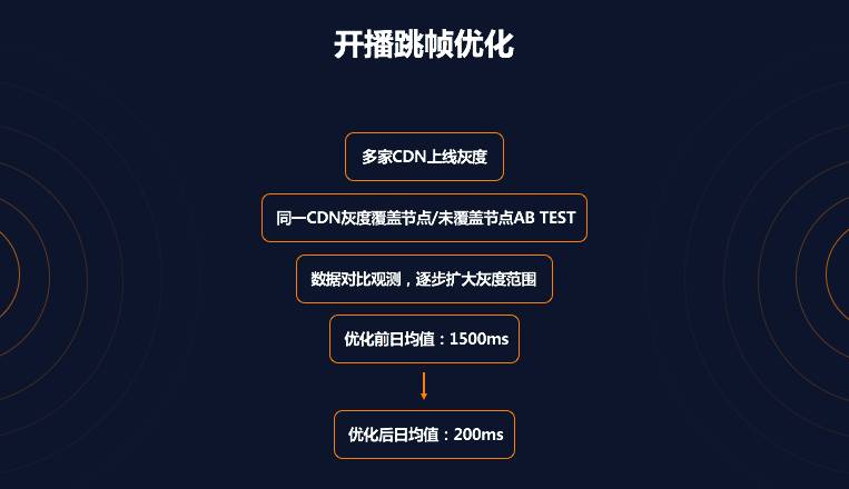 客户端进一步优化。经过上一步的优化之后,开播跳帧长度并没有完全消除,而 CDN 端的优化手段有限,这时再尝试客户端优化掉最后的 200ms。我们选择在客户端实施缓慢快进方案,让用户察觉不到播放速度的变化,但是快速的把这 200ms 消耗掉,通过 AB TEST 观察数据,然后全量上线。