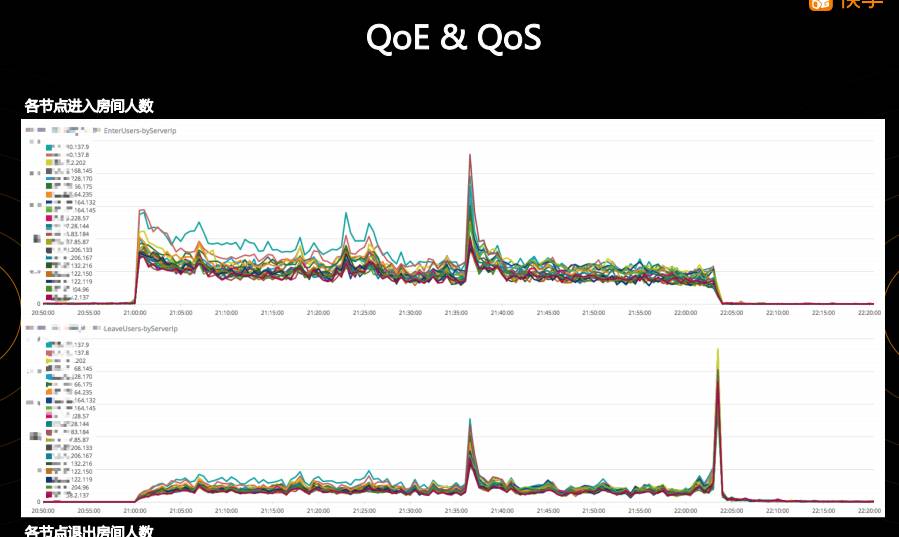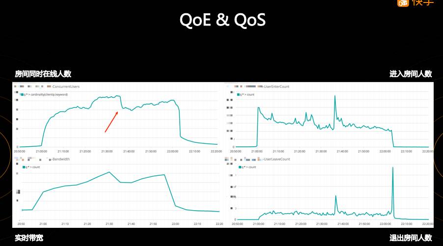我们以下图的“进入房间人数”和“退出房间人数”分析,说明一下我们是怎么做联合 QoE 数据和 QoS 数据进行监测和分析的。首先看看 QoE 数据,左上角是快手某次直播房间的同时在线人数曲线,在直播过程中在线人数有一个“掉坑”的现象,右下角的“退出房间人数”曲线显示在九点三十多分有一个峰值,说明有大量用户退出房间,我们推测这里可能发生了某些问题导致了观看人数的大量减少,有可能是非技术性的,比如主播做了一件事情观众们不太喜欢,会导致观众大量流失。奇怪的是,右上角的“进入房间人数”曲线显示,进入房间在同样时刻也有一个峰值,这个时候说明虽然有大量用户退出了房间,但是同时也大量的进入了该房间。这里我们可以通过 QoE 数据得出一些结论,这一次观众大量退出,应该不是由于直播内容导致的,而是快手的直播服务有问题导致的,因为观众大量退出同时也大量进入,是因为观众觉得重新打开直播可能可以解决问题,退出直播并不是因为他们不再想看这个直播了 。