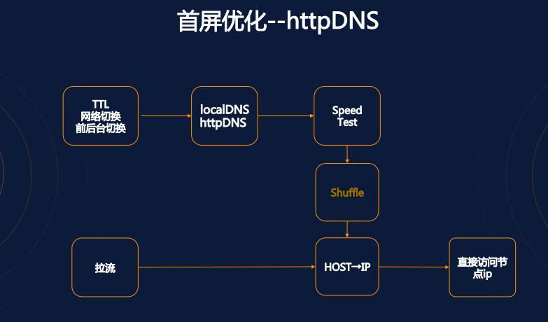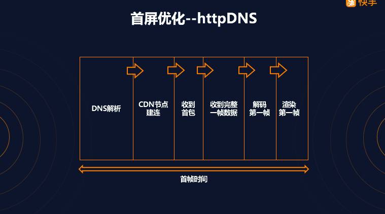 我们要分享的第二个优化点是首屏的优化,首屏的整个过程,大致可以分为下图的这六个步骤,快手对各步骤的耗时做了详尽的分析,分析结果显示,DNS 解析其中是最耗时的环节,因此要降低首屏时间,必须先降低 DNS 解析时间。