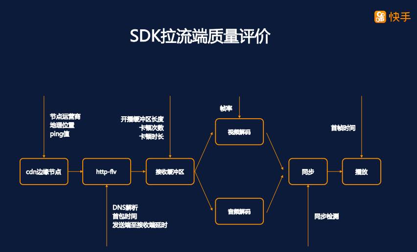 我们再来看看拉流(播放)端,拉流端整体的流程和推流端是一个反过来的流程,客户端先经过 DNS 解析,连接到 CDN 的边缘节点,和推流端类似,需要对 DNS 解析时间,边缘节点的运营商、地理位置、RTT 值等关键信息进行采集;从 CDN 边缘节点拿到的 http-flv 数据会先经过解封装送到接收缓冲区,在这个阶段可以对 CDN 服务节点的首包时间,发送至接收的端到端延时进行统计;接收缓冲区的长度决定了拉流端的网络抗性,这里可以采集到卡顿的次数和时长,缓冲区本身的长度也是需要监控的点;数据从缓冲区的输出,会分别进行音频和视频的解码,经过音视频同步,进入播放环节。这里从拉流启动到播放出第一帧画面的时间就是首帧时间。
