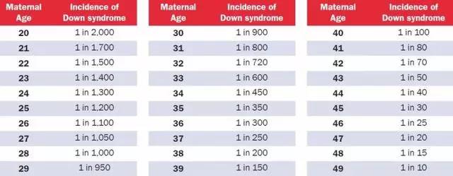 对于不同年龄阶段的母亲,产下唐氏综合征患儿的风险都有明确的数值,而这些数值并未考虑父亲的影响。图片来源:http://www.ndss.org/