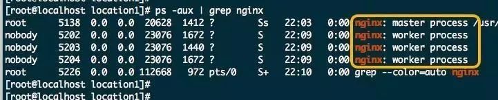 按照上文中的配置清单的实验,我们给worker_processes配置的数目是:3,启动Nginx服务器后,我们可以后台看一下主机上的Nginx进程情况: