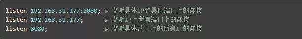 第一种:配置监听的IP地址:listen IP[:PORT];