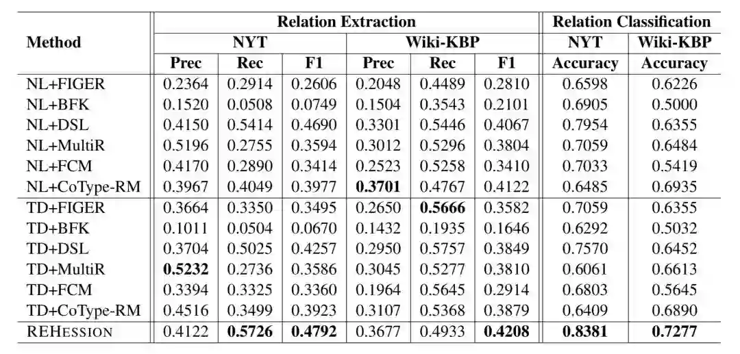 本文使用 NYT 和 Wiki-KBP 两个数据集进行了实验,标注来源一方面是知识库,另一方面是人工构造的模板。每组数据集进行了包含 None 类型的关系抽取,和不包含 None 类型的关系分类。