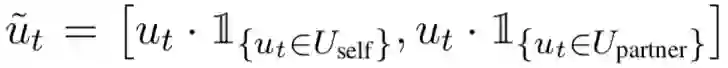Mentions vector M_t(v) 表示在 t 时刻的对话中与节点 v 相关的上下文信息。对话的表示 u_t 由个 LSTM 络计算得到(后文会提到),为了区分 agent 自身产生的对话语句和另一个代理产生的对话语句,对话语句表示为: