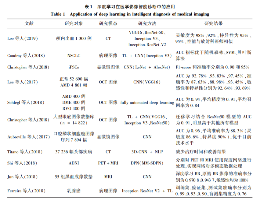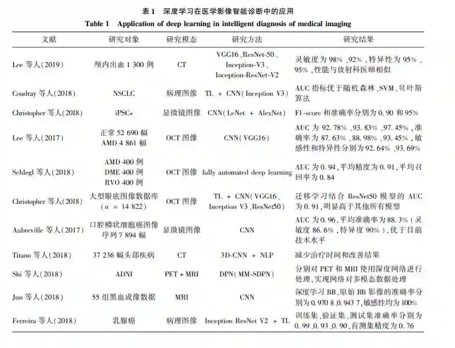 针对眼底病变,应用深度学习提出了一种自动 检测眼底图像中糖尿病视网膜病变和糖尿病黄斑水 肿的算法,对基层医生正确筛选患者有着重要意义 (Gulshan 等,2016;Ting 等,2017),但由于训练样本 及专家分级的限制,无法处理大多数眼科医生也无 法识别的细微图像,不能代替综合眼科检查。Kermany 等人(2018)提出基于深度学习的卷积神经网 络 Inception V3 模型和迁移学习( transfer learning, TL)的诊断模型,用于眼底疾病的分类,并在儿童肺 炎诊断上验证了该模型的泛化性能,实现了秒级判 定和人工智能精确指导抗生素合理使用的功能。针 对皮肤癌,Esteva 等人(2017) 使用卷积神经网络 Inception V3 对皮肤癌图像进行分类,准确率达到 91% ,可与专业医生媲美。针对肺癌,Coudray 等人 (2018)使用迁移学习和 Inception V3 模型对非小细 胞肺癌( non-small cell lung cancer,NSCLC) 病理图 像进行分类,结果表明深度学习模型可以为专家和 患者提供快速、准确和廉价的癌症类型或基因突变 检测,对癌症治疗产生了重大影响。针对脑部疾病, Choi 和 Jin(2018) 提出一种深度卷积神经网络,使 用18 F-脱氧葡萄糖( 18 F-Fluorodeoxyglucose, 18 F-FDG) PET(positron emission tomography)图像准确预测阿 尔茨海默氏症(Alzheimer’ s disease,AD) 和轻度认 知障碍( mild cognitive impairment,MCI) 患者,可以 尽快确定并有效治疗受试者。Lee 等人(2019)训练 小样本 的 头 部 计 算 机 断 层 扫 描 ( computed tomography,CT)图像创建人工智能诊断平台,诊断颅内 出血的准确率能与医生媲美。该平台通过对小样本 数据的增强处理,解决了深度学习样本量的问题,决 策过程及诊断依据的可视化解决了人工智能算法的 黑盒问题。针对鼻咽癌,中山大学孙颖团队首次利 用人工智能实现了全期鼻咽癌精准放射治疗靶区自 动勾画(Lin 等,2019)。针对计算机视觉问题,由于 缺乏大型高质量已标注数据集,医学影像的深度学 习研究一度面临巨大挑战,对此,Xie 等人(2019)提 出了一种基于多视角知识协同( multi-view knowledge-based collaborative,MV-KBC)深度学习模型,使 用 ResNet-50 网络对胸部 CT 图像进行肺结节良恶性分类,结果明显优于当前最先进的方法。随着人 工智能的高速发展,曾经的巨大挑战正在逐步攻破。