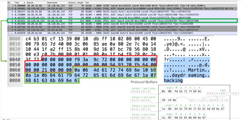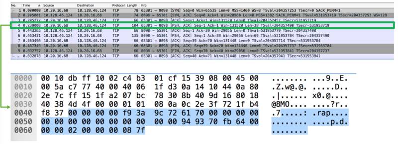 下面继续深入到 binary stream 级别观察,使用嗅探工具来看看 TCP 包。一般使用 wireshark 或者 tcpdump。