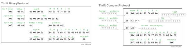 再举个例子,使用 Thrift 做同样的序列化,采用 Binary Protocol 和 Compact Protocol 的大小是不一样的,但是 Compact Protocol 和 PB 虽然序列化的编码不一样,但是同样是非常高效的。