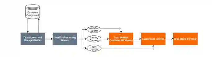 图4显示了训练管道的可视化。第一步需要收集历史威胁评估数据以及ADO威胁标签(如果所需的ML模型使用监督学习算法)。接下来,这些数据将通过数据预处理模块合并为格式良好的数据集。然后,这个大型数据集将被分成三个不同的集合: