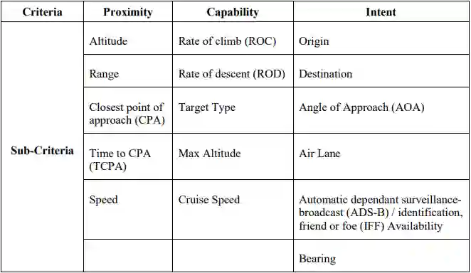 对于空中威胁评估,已经确定了16个线索来构成关于目标的最有价值的信息[4]。这些见表 1。