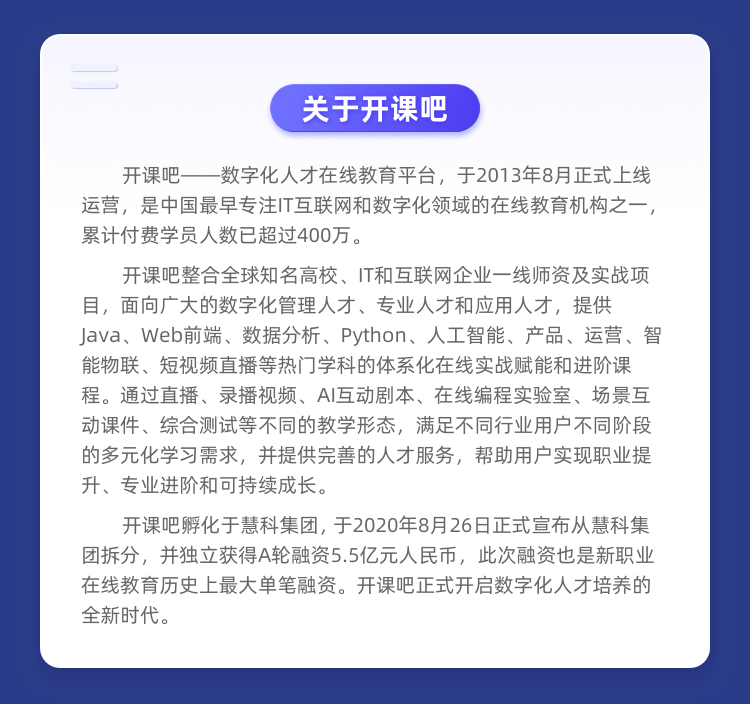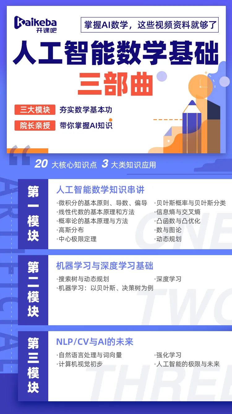 扫码下方的二维码,报名参加我们的课程。在享受超强课程优惠的同时,你还将获得由开课吧精心为你准备的AI学习资料《人工智能数学基础三部曲》。