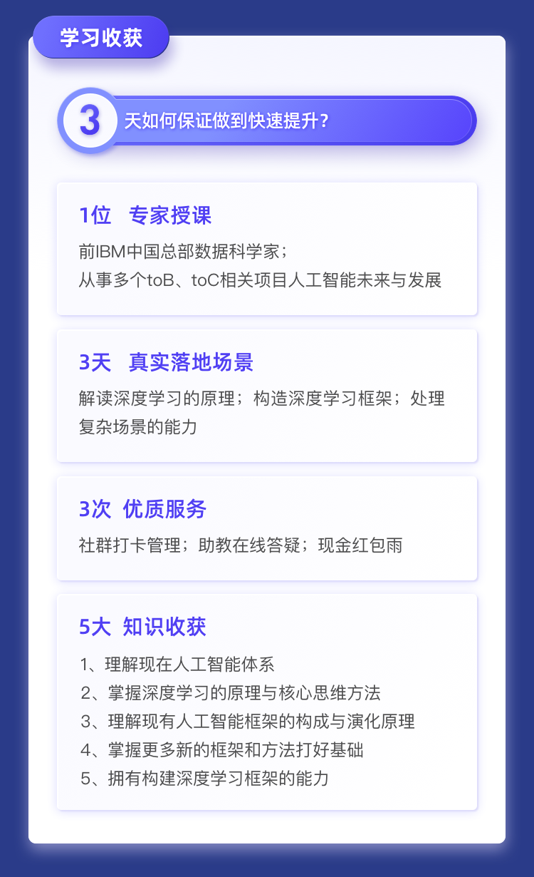 通过3天的《用纯Python从零创造自己的深度学习框架》,了解人工智能体系及整体框架结构,用最短的时间一次性掌握深度学习的原理与核心思维方法,深入理解人工智能框架的构成与演化原理。
