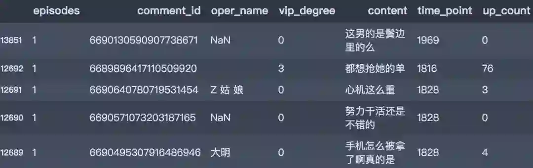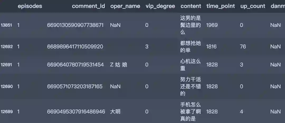 # 读入数据data_list = os.listdir('../data/')df_all = pd.DataFrame()for i in data_list:# 判断if i.split('.')[-1] == 'csv':df_one = pd.read_csv(f'../data/{i}', engine='python', encoding='utf-8', index_col=0)df_all = df_all.append(df_one, ignore_index=False)df_all.info()<class 'pandas.core.frame.DataFrame'>Int64Index: 271049 entries, 0 to 17637Data columns (total 7 columns):# Column Non-Null Count Dtype--- ------ -------------- -----0 episodes 271049 non-null int641 comment_id 271049 non-null int642 oper_name 139035 non-null object3 vip_degree 271049 non-null int644 content 271049 non-null object5 time_point 271049 non-null int646 up_count 271049 non-null int64dtypes: int64(5), object(2)memory usage: 16.5+ MB