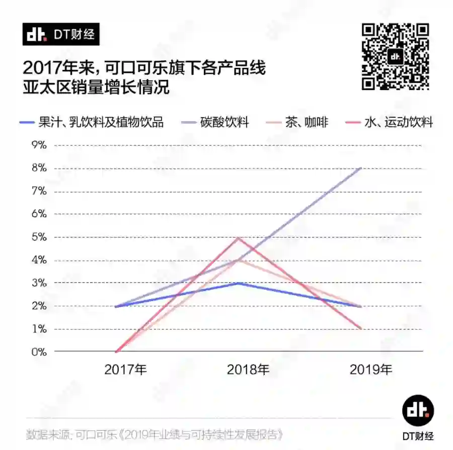 从2017年到现在,可口可乐旗下四条主要产品线在亚太区都有一定增长。而低糖化的策略让家底最厚、发力最猛的碳酸饮料线成为成绩最好的一支。产品线扩展策略的好处在这里得到充分体现:适时推出恰当的新产品,能够促进整体的销售增长。