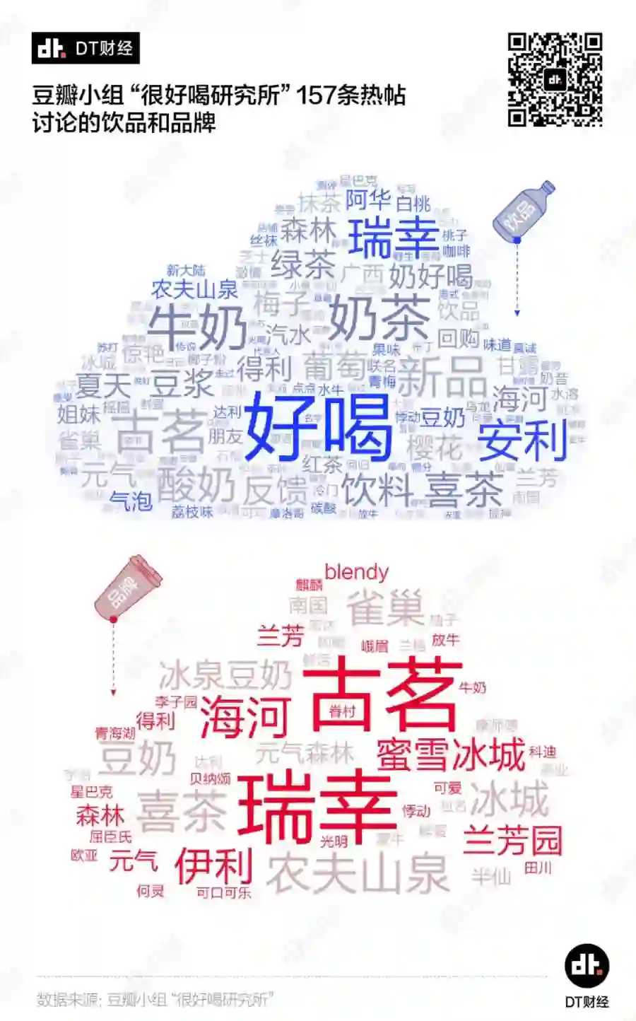 在拥有11万名组员的豆瓣小组“很好喝研究所”,我们收集了4月最热门的157条帖子。从这些帖子标题中我们看到,奶茶和牛奶仍然是大家最关心的饮品种类。