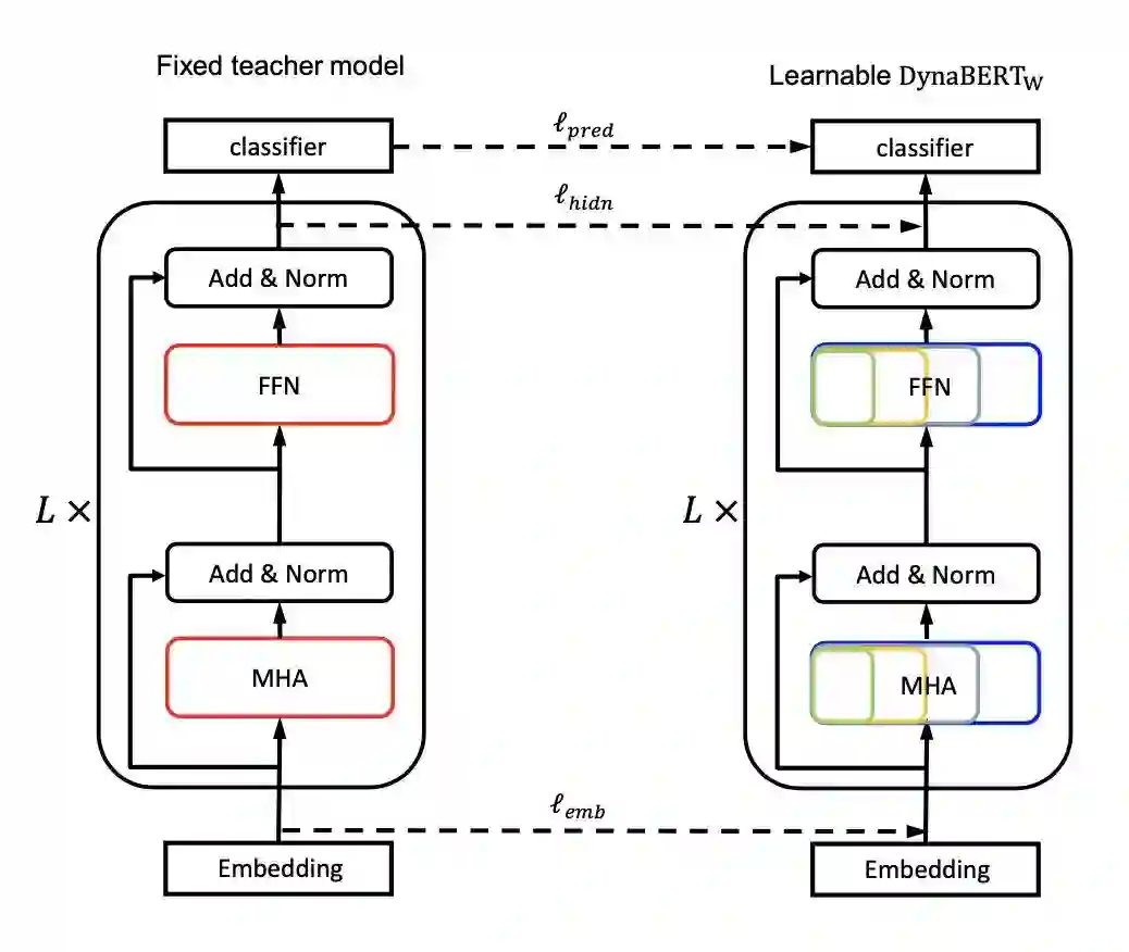 本篇论文的创新点主要在于Adaptive width的训练方式,考虑到后续的裁剪,作者对head和neuron进行了排序,并利用蒸馏让子网络学习大网络的知识。