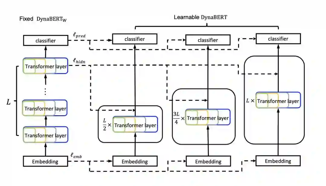 训好了width-adaptive的模型之后,就可以训自适应深度的了。浅层BERT模型的优化其实比较成熟了,主要的技巧就是蒸馏。作者直接使用训好的 作为teacher,蒸馏裁剪深度后的小版本BERT。