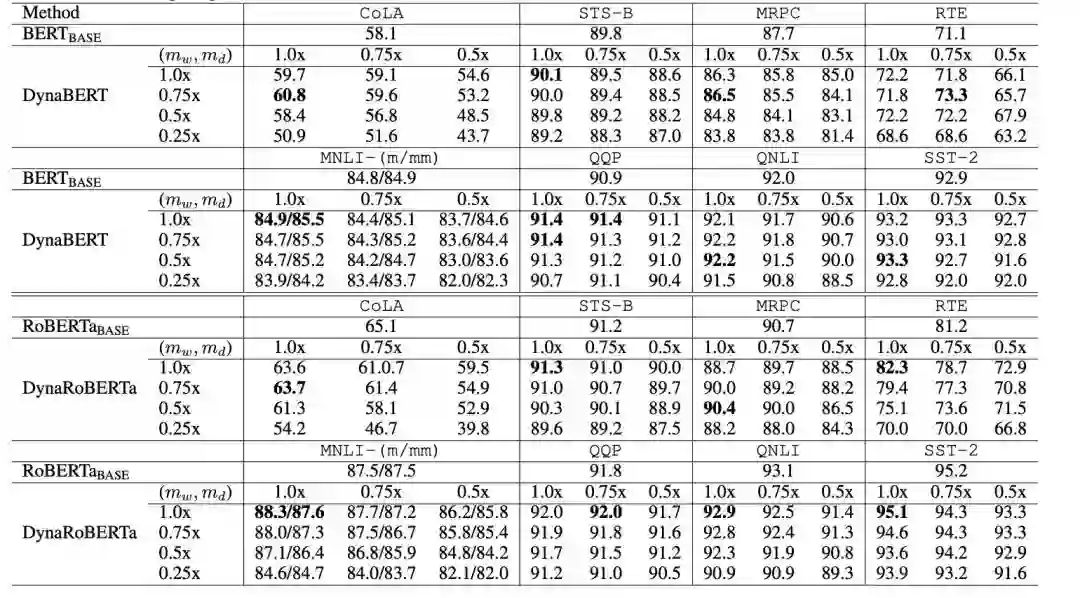 另外,作者还和DistillBERT、TinyBERT、LayerDrop进行了实验对比,DynaBERT均获得了更好的效果。