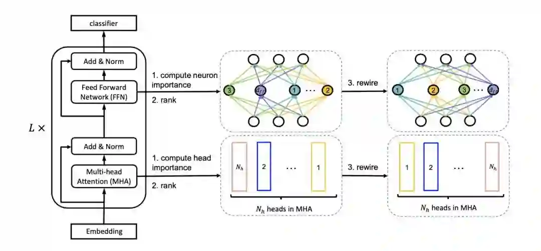 在MHA中,我们认为不同的head抽取到了不同的特征,因此每个head的作用和权重肯定也是不同的,intermediate中的神经元连接也是。如果直接按照 粗暴裁剪的话,大概率会丢失重要的信息,因此作者想到了一种方法,对head和神经元进行排序,每次剪枝掉不重要的部分,并称这种方法为Netword Rewiring。