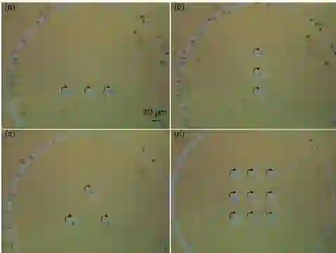除了控制藻类细胞机器人定向运动,我们又进一步实现了藻类细胞机器人的阵列化旋转。结合光诱导介电泳技术(ODEP),建立了藻类细胞在ODEP微环境中的转动状态模型和受力模型,实现了对藻类细胞的快速捕获及阵列化旋转,且通过改变光强可有效调节细胞旋转速度,如图2。构建的藻类细胞旋转阵列有望作为微尺度马达阵列,在微流控及生物驱动领域发挥重要作用。