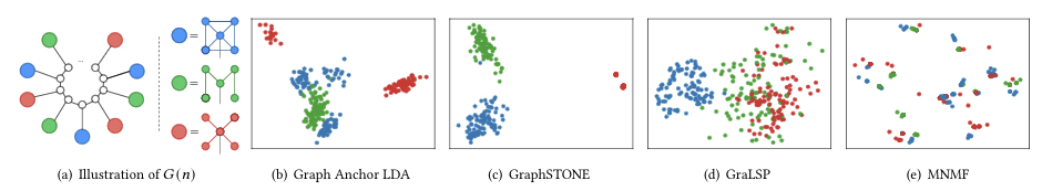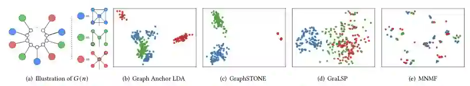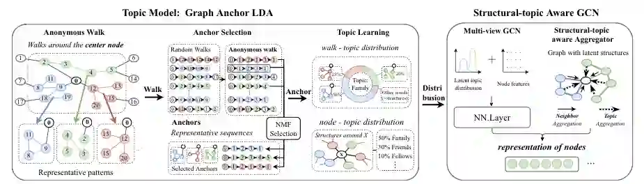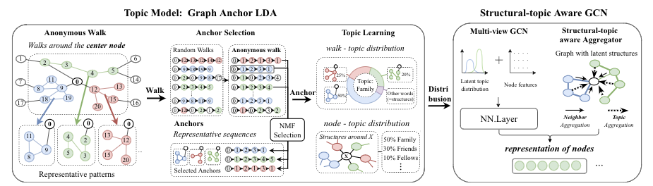据此,本文提出一种图结构主题神经网络模型(GraphSTONE)。本文所提出模型框图如图 2 所示,GraphSTONE 首先借鉴融合自然语言处理中的主题模型(Topic Models),来刻画此类高阶结构模式在分布上的差异。本文从理论上分析了在图网络学习子结构主题分布的合理性,并提出针对子结构分布自适应的图神经网络以高效利用此类结构信息。针对现实网络子结构的复杂性,我们设计了锚结构(Anchor)选择算法,以筛选网络中有代表性的结构特征,从而降低表征复杂度和噪声干扰。关于本文算法的细节,请参阅论文。