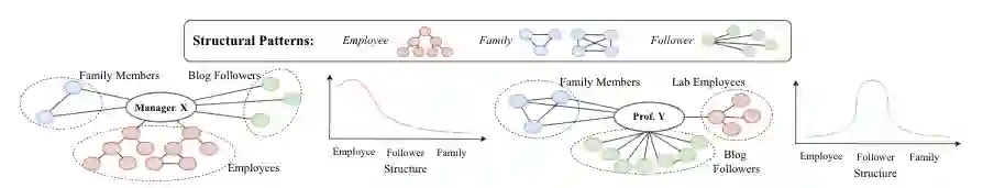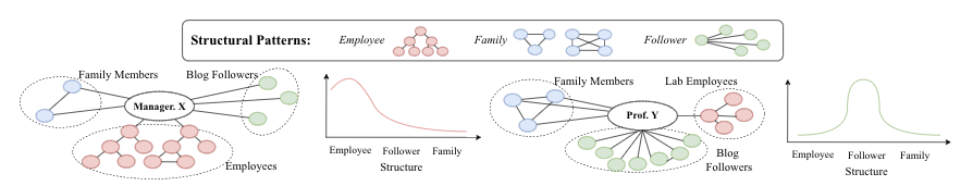由于现实网络中节点的复杂性,节点邻域会包含许多不同种类的节点,因而其中的高阶结构模式往往只能在其分布上体现差异(如图 1,对于一个经理和一个教授的社交网络,虽然他们都有职员(学生)、家庭和社交媒体关注者三种社会关系,但是经理一般会带领更大的团队,而教授在社交媒体上受关注多,导致了他们高阶结构模式的类型相同,但是分布不同)。