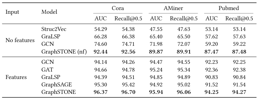 我们在现实数据和仿真网络中进行了实验。在仿真数据中,GraphSTONE 能够很好表征并区分不同的子结构模式(图 3),并学习到子结构的关键性分布(图 4)。在学术网络、蛋白质网络等现实数据上,GraphSTONE 相比传统方法,在无特征链接重构和节点分类任务下能够获得 10% 以上显著提升,在有特征情况下总体表现最佳。