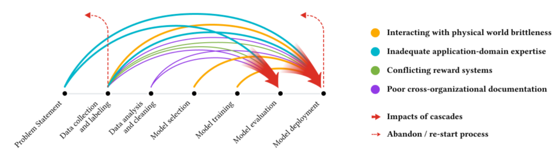 借助环保路线,Google 地图将显示最快的路线和最省油的路线,用户可以选择最适合的路线。 Google 地图中的野火层可在紧急情况下为人们提供重要的最新信息。 趋势 5:对机器学习更深入和更广泛的理解 随着 ML 在技术产品和社会中更广泛地使用,我们必须继续开发新技术以确保公平公正地应用它,造福于所有人,而不只是其中一部分。 一个重点领域是基于在线产品中用户活动的推荐系统。由于这些推荐系统通常由多个不同的组件组成,因此了解它们的公平性通常需要深入了解各个组件以及各个组件组合在一起时的行为方式。 与推荐系统一样,上下文在机器翻译中很重要。由于大多数机器翻译系统都是孤立地翻译单个句子,没有额外的上下文,它们通常会加强与性别、年龄或其他领域相关的偏见。为了解决其中一些问题,谷歌在减少翻译系统中的性别偏见方面进行了长期的研究。 部署机器学习模型的另一个常见问题是分布偏移:如果用于训练模型的数据的统计分布与作为输入的模型的数据的统计分布不同,则模型的行为有时可能是不可预测的。 数据收集和数据集管理也是一个重要的领域,因为用于训练机器学习模型的数据可能是下游应用程序中偏见和公平问题的潜在来源。分析机器学习中的此类数据级联有助于识别机器学习项目生命周期中可能对结果产生重大影响的许多地方。这项关于数据级联的研究在针对机器学习开发人员和设计人员的修订版 PAIR Guidebook 中为数据收集和评估提供了证据支持的指南。 不同颜色的箭头表示各种类型的数据级联,每个级联通常起源于上游,在机器学习开发过程中复合,并在下游表现出来。 创建更具包容性和更少偏见的公共数据集是帮助改善每个人的机器学习领域的重要方法。 2016 年,谷歌发布了 Open Images 数据集,该数据集包含约 900 万张图像,标注了涵盖数千个对象类别的图像标签和 600 个类别的边界框注释。去年,谷歌在 Open Images Extended 集合中引入了更具包容性的人物注释 (MIAP) 数据集。该集合包含更完整的针对人类层次结构的边界框注释,并且每个注释都标有与公平相关的属性,包括感知的性别表示和感知的年龄范围。 此外,随着机器学习模型变得更有能力并在许多领域产生影响,保护机器学习中使用的私人信息仍然是研究的重点。沿着这些思路,我们最近的一些工作解决了大型模型中的隐私问题,既能从大型模型中提取训练数据,又指出如何在大型模型中包含隐私。除了联邦学习和分析方面的工作之外,谷歌还一直在使用其他有原则和实用的机器学习技术来强化工具箱。