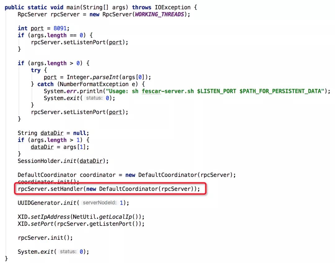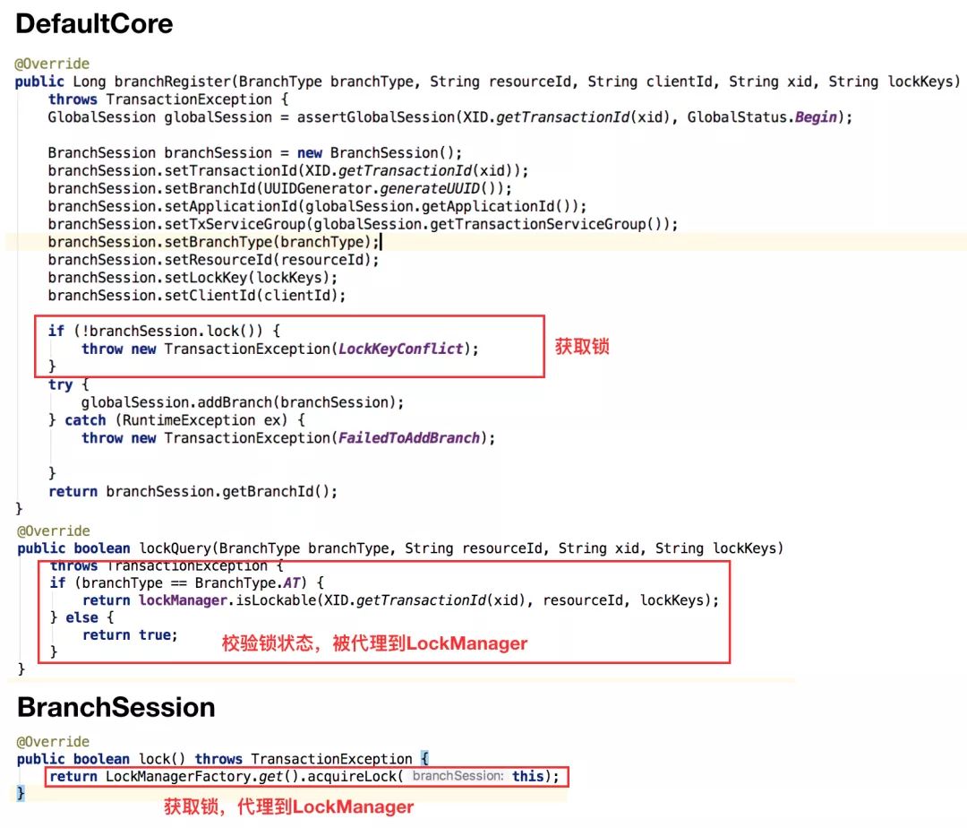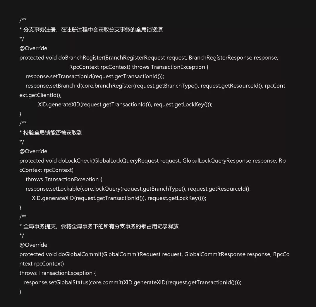 上图中看出RpcServer处理通信协议相关逻辑,而对于TC模块真实处理器是DefaultCoordiantor,里面包含了所有TC对外暴露的功能,比如doGlobalBegin(全局事务创建)、doGlobalCommit(全局事务提交)、doGlobalRollback(全局事务回滚)、doBranchReport(分支事务状态上报)、doBranchRegister(分支事务注册)、doLockCheck(全局写排它锁校验)等,其中doBranchRegister、doLockCheck、doGlobalCommit就是全局写排它锁实现方案的入口。