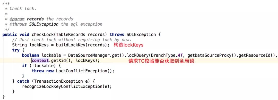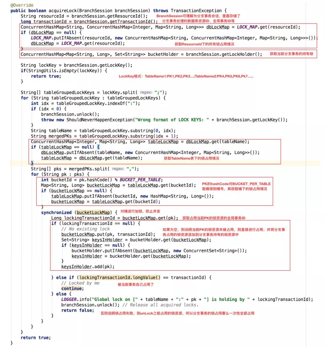 整体上,锁结构采用Map进行设计,前半段采用ConcurrentHashMap,后半段采用HashMap,最终其实就是做一个锁占用标记:在某个ResourceId(数据库源ID)上某个Tabel中的某个主键对应的行记录的全局写排它锁被哪个全局事务占用。下面,我们来看一下具体获取锁的源码: