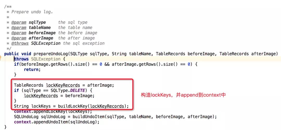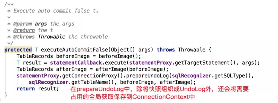 接下来我们再来看看分支事务如何提交,对于分支事务中需要占用的全局锁资源如何生成和保存的。首先,在执行SQL完业务SQL后,会根据beforeImage和afterImage生成UndoLog,与此同时,当前本地事务所需要占用的全局锁资源标识也会一同生成,保存在ContentoionProxy的ConnectionContext中,如下图所示。