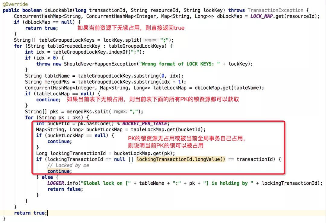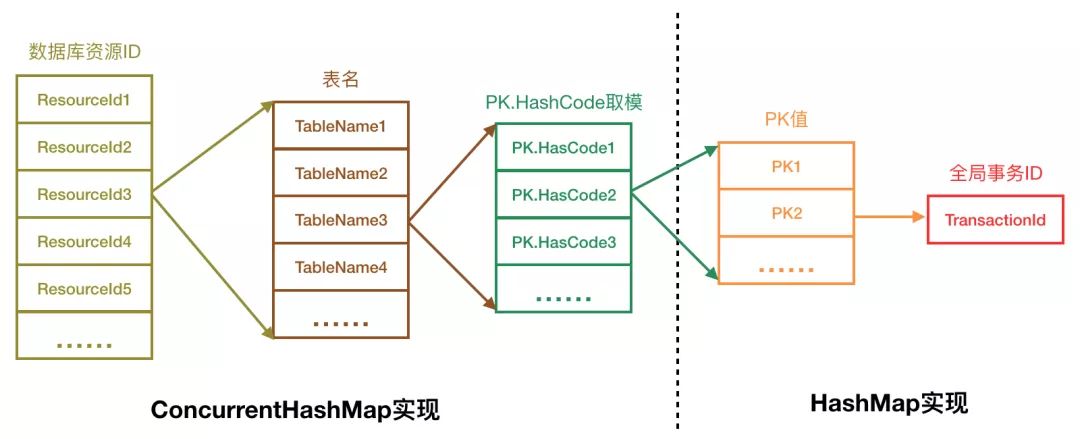 前半部分采用ConcurrentHashMap好理解:为了支持更好的并发处理;疑问的是后半部分为什么不直接采用ConcurrentHashMap,而采用HashMap呢?可能原因是因为后半部分需要去判断当前全局事务有没有占用PK对应的锁资源,是一个复合操作,即使采用ConcurrentHashMap还是避免不了要使用Synchronized加锁进行判断,还不如直接使用更轻量级的HashMap。