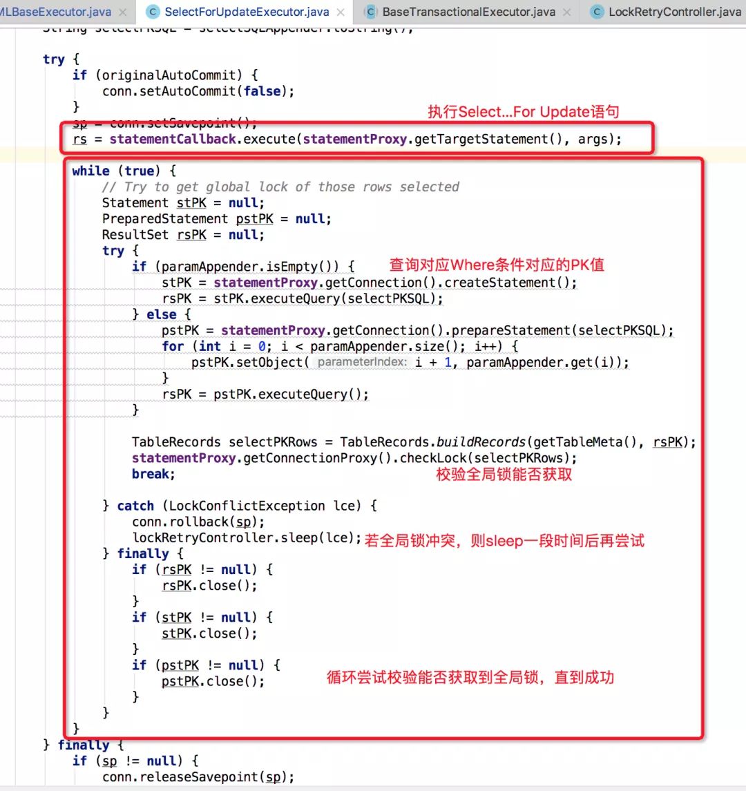循环掌握校验全局锁能否被获取,由于全局锁可能会被先于当前的全局事务获取,因此需要等之前的全局事务释放全局锁资源;如果这里校验能获取到全局锁,那么由于步骤1的原因,在当前本地事务结束前,其它本地事务是不会去获取全局锁的,进而保证了在当前本地事务提交前的分支事务注册不会因为全局锁冲突而失败。