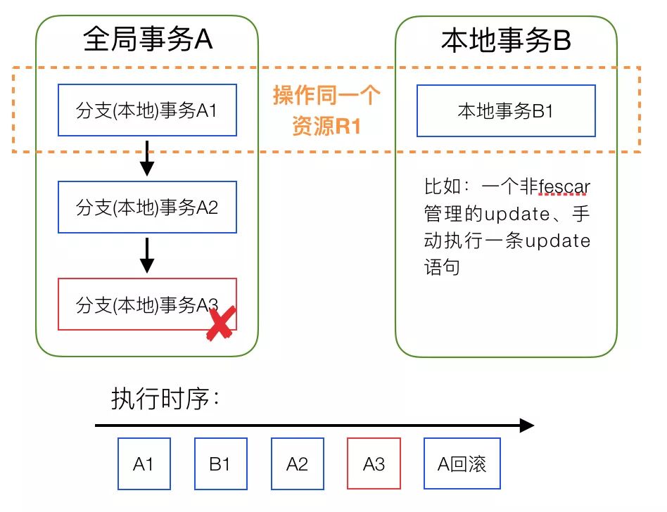 一个Fescar管理的全局事务和一个非Fescar管理的本地事务之间发生锁冲突怎么办?具体问题如下图,问题是:全局事务A如何回滚?