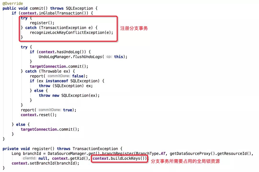 在ContentoionProxy.commit中,分支事务注册时会将ConnectionProxy中的context内保存的需要占用的全局锁标识一同传递给TC进行全局锁的获取。
